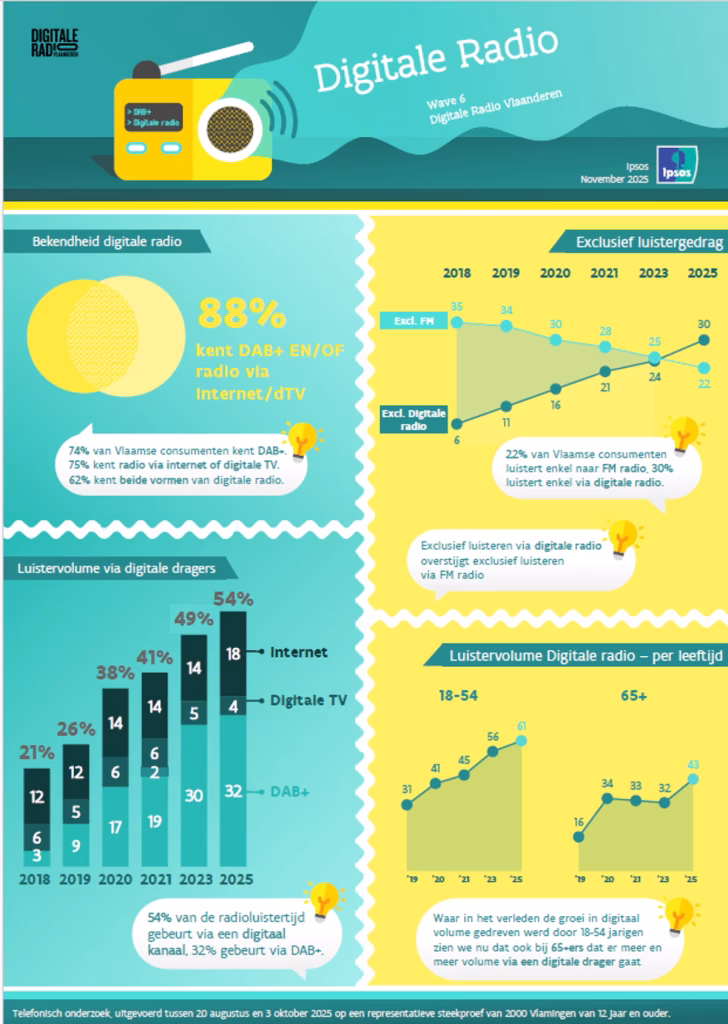 Vlamingen omarmen massaal digitale radio. Nieuwe cijfers uit het tweejaarlijks onderzoek, uitgevoerd door IPSOS in opdracht van Vlaams minister van Media Cieltje Van Achter, tonen aan dat Vlaanderen een kantelpunt heeft bereikt in het digitale radioluisteren. In 2025 gebeurt inmiddels meer dan de helft (54%) van het luistervolume via digitale kanalen (DAB+, internet of digitale tv). Dat is een stijging ten opzichte van 2023, toen dat aandeel nog 49% bedroeg. Bovendien luistert vandaag 30% van de Vlamingen uitsluitend digitaal, tegenover 24% twee jaar geleden. Daarmee zijn er ook voor het eerst meer Vlamingen die enkel digitaal luisteren dan mensen die enkel via FM luisteren. Waar tot 2023 vooral de doelgroep tot 54 jaar de overstap maakte naar digitale radio, zien we de afgelopen twee jaar vooral een inhaalbeweging bij 65-plussers. DAB+ is de populairste digitale luistervorm met 32% van het totale luistervolume. Ook digitaal luisteren via internet maakt een sprong vooruit, naar 18% van het luistervolume.